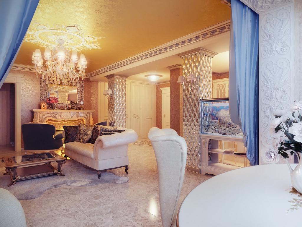 - Fondos de pantalla para o teito na sala de estar . Os teitos escuros pódense pegar só aos propietarios dunha sala espazos. Na maioría das veces, aquí úsanse fondos de pantalla brancos ou beis. Se prefires un pano coloreado, intente combinalo con mobiliario, chan e decoración decorativa.